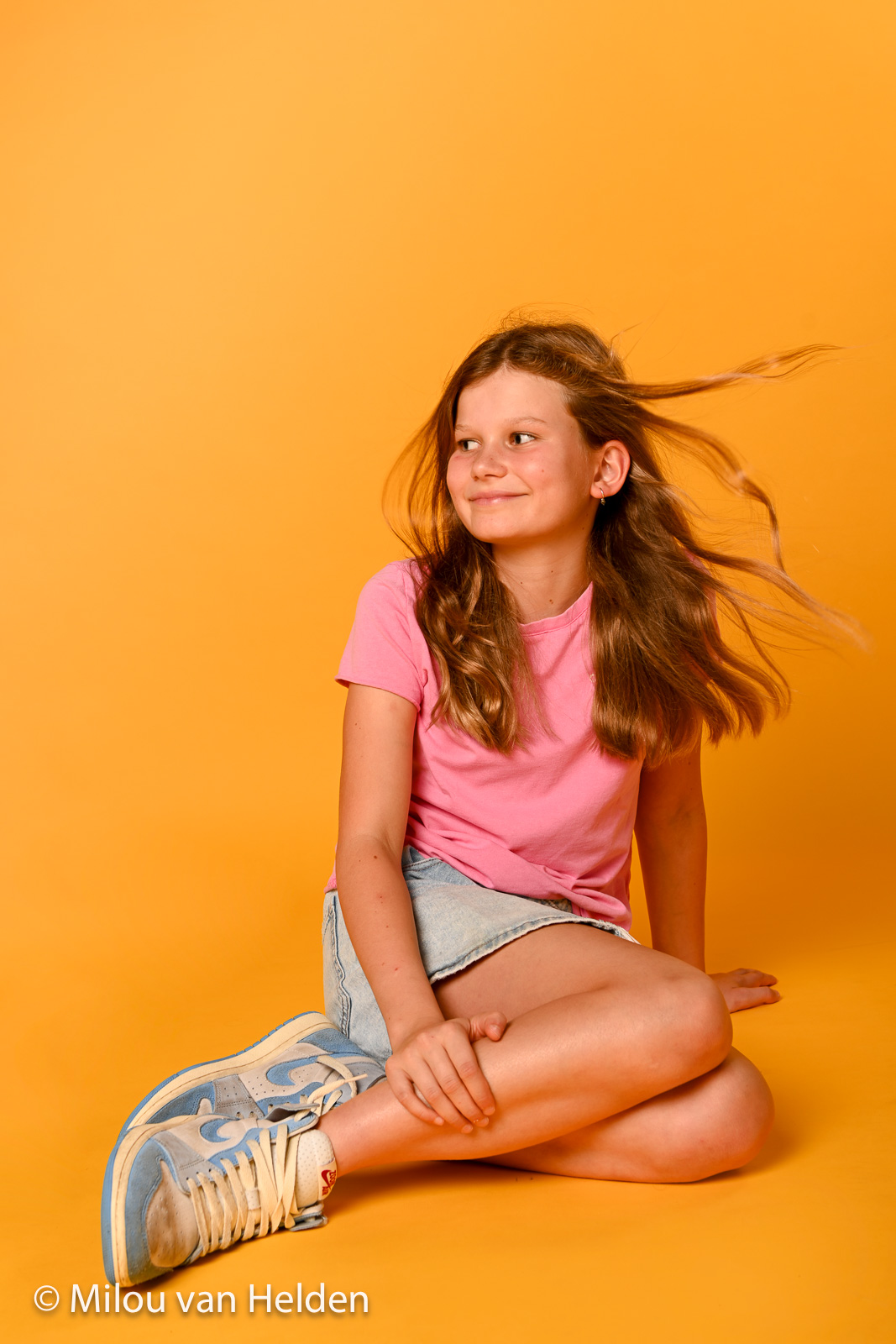 Tijdens de shoot wordt bij de meeste shoots ook nog van outfit gewisseld (kijk bij de samenvatting hieronder hoeveel kleding je bij deze shoot mee moet nemen). Hierin kun je het zo simpel of bont maken als je zelf wilt. De verschillende outfits zorgen voor variatie en zetten een bepaalde stijl neer, dat heb je dus zelf in de hand met de outfits die je meeneemt. Dragen jullie je haar los? In de studio staat een grote ventilator die zorgt voor het mooie wapperende-haar effect!